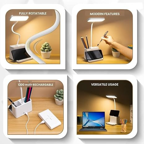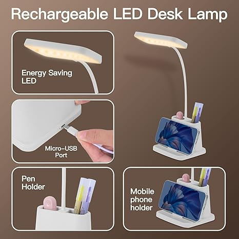 This LED desk lamp is awesome for studying. The color modes are easy on the eyes, and the touch on/off is super convenient. I love the built-in pen and phone holder—it keeps everything organized. Plus, it's rechargeable, so no messy wires. Compact, bright, and practical—great buy for students!
