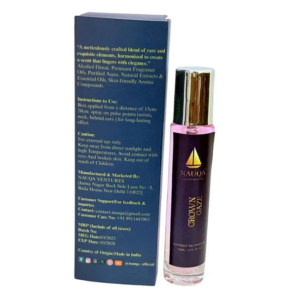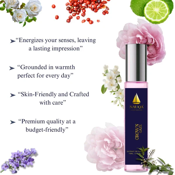 Step into elegance with NAUQA™ CROWN GAZE – a luxurious Extrait de Parfum designed for women who embody both strength and softness. With up to 25% fragrance oil concentration, this exquisite scent blends floral sophistication with warm, musky sensuality, creating a truly unforgettable presence.