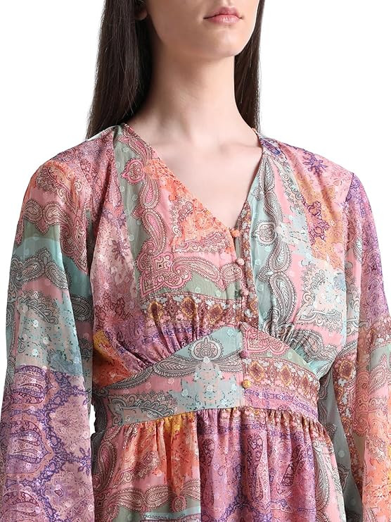 Short dress in All over printed chiffon weave with a V-neck , opening buttons down the front. Long sleeves with covered elastic cuff , ,inserted smock details at back waist Gentel flared skirt. lined.