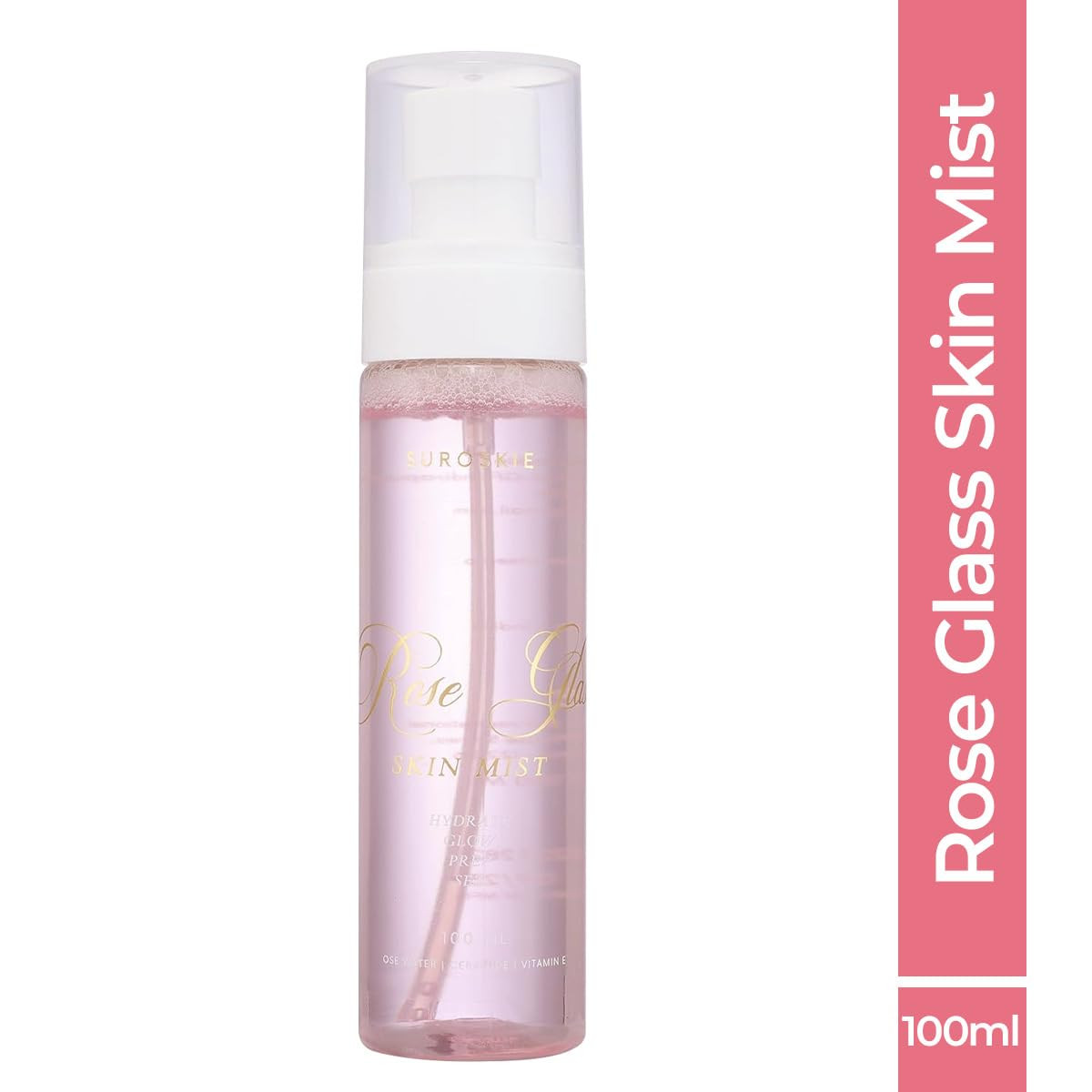 SUROSKIE introducing the Rose Glass Skin Mist is a multifunctional skincare solution designed to refresh, hydrate, and maintain optimal moisture levels throughout the day, while simultaneously tightening pores and preparing the skin for enhanced absorption of subsequent products. Formulated with a blend of nourishing ingredients such as rose water, hyaluronic acid, aloe vera, cucumber water, Vitamin E, peach extracts, and botanicals, it promotes a soft, healthy, and radiant complexion. Suitable for all skin types, this mist serves after cleanser as toner, and gentle moisturizer, effectively improving skin texture by reducing redness, inflammation, and dark spots, while delivering a calming and revitalizing experience with every application.